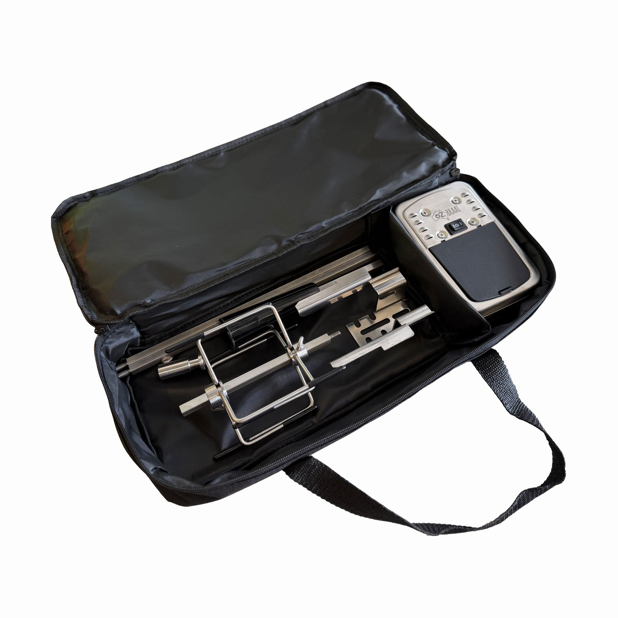 The bag comfortably fits your rotisserie motor, spit rod, brackets and accessories, while still leaving room for gloves, firelighters, thermometers or small braai tools.